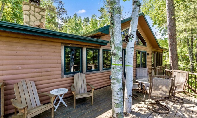 The home features a wood-burning stone fireplace, wood floors, and a large screened porch, providing cozy spaces for relaxation. A unique deck, with a mature birch tree growing through its center, enhances the natural beauty of the setting. The master bedroom’s large double windows open to the tranquil sounds of the lake, perfect for enjoying the soothing calls of loons at night.
