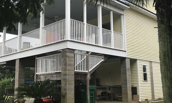 Gorgeous house by the river! Boat dock. Slip nearby. Plenty of parking for cars and trailer. Covered carport/patio area with table and chairs, gas grill and large stainless sink area. Walk up the stairs onto a covered deck with dining table and plenty of seating.. Perfect Home Away From Home. :) Located on the Beautiful Pascagoula River, the largest free flowing river in the US. Short Drive from Golf Courses, Nature preserves and other great activities.... or just relax and enjoy the view!
