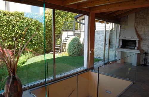 Modern and luxurious apartment of 120 square meters, with a beautiful glass lounge / veranda. You enter the living room on the right and on the left there is a practical and modern independent kitchen. The glass door divides the living area from the sleeping area, consisting of a first double bedroom with attached bathroom and another double bedroom with twin beds with adjoining bathroom. Comfort and furnishings with refined finishes. Outside garden with pool to be shared with two more apartments. Free parking in front of the house.