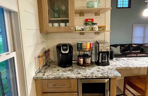 A recently completed kitchen and dining room remodel (May 2025) added a dishwasher, new cabinets, stainless steel appliances, and granite countertops. The expanded beverage station continues to supply a variety of K-Cups, teas, hot chocolate, creamers, and sugars while adding a separate beverage fridge. The breakfast bar provides casual seating for 4, offering peek-a-boo views of the living room television. The dining table includes seating for up to 8 for larger family meals. The kitchen remains fully outfitted with assorted equipment for cooking and baking. The completely renovated bathroom offers a walk-in shower with a hand-held sprayer (no tub). Other interior features include central air conditioning and a washer and dryer.