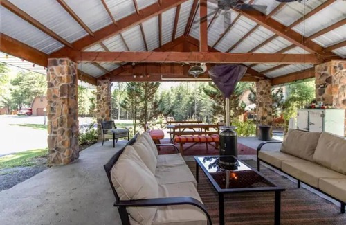 Enjoy relaxing on the cozy wrap around porch where you can experience the sights and sounds of nature. Inside delight in the aroma of cedar and be in an awe of the beautiful, beaded wood ceiling and stone hearth fireplace. There is a convenient first-floor bedroom, bedroom loft, full kitchen, central AC, fitness room, spa shower and more. Forget your worries in this spacious and serene space.