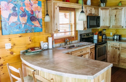 Our cabin is handicapped accessible on the first level. The kitchen has a purified osmosis water filtration system, brand new appliances, dishwasher, microwave, radiant glass top stove, porcelain tile counter tops and a breakfast bar. The dining table will comfortably seat 8. The downstairs Master bedroom features a king bed and its own bathroom area with washer/dryer. In the upstairs bedroom you will find 1 king bed and 2 twin beds. In the loft area a day bed with trundle bed.