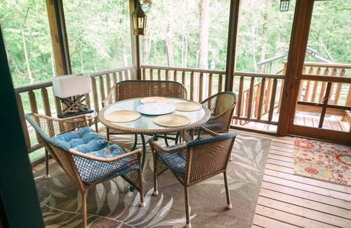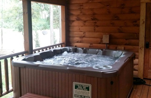 Step into our warm cozy detailed cabin where you can relax, sink down into the leather furniture in the living room by the wood burning fireplace and enjoy the cozy rustic luxury. Perhaps you would rather sit out on the screened in porch, or just relaxing in the hot tub as all your worries and cares melt away in this serene surrounding.