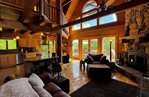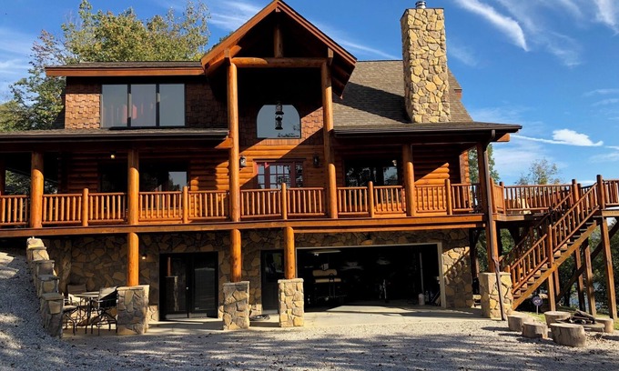 This impressive and modern log cabin features soaring ceilings and a relaxed layout. The main living area, kitchen, laundry room, ½ bath, and master bedroom suite are easily accessed on the main floor, which also features a wrap-around covered porch and expansive back sundeck for taking in the views of beautiful Lake Cumberland. Spend evenings relaxing with the family and enjoying alfresco meals on the deck using the six-person table and chairs or move to the firepit for smores and storytelling on a chilly evening.