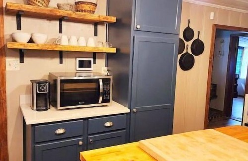 Kitchen has been remodeled with granite countertops, butcherblock island, full size convection oven, full size refrigerator, dishwasher, large farm sink, microwave, coffee maker, and all basic kitchen essentials.