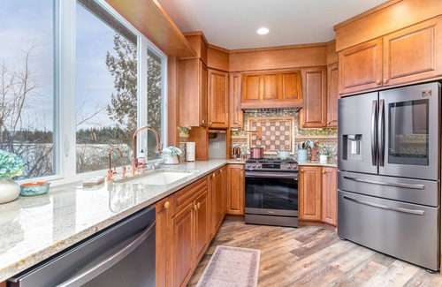 Truly a chef's dream the custom kitchen features ample meal prep space, a suite of stainless steel appliances, and many cooking utensils. Show off your culinary skills here before dining family-style at the formal dining table, or alfresco on the lake view deck.