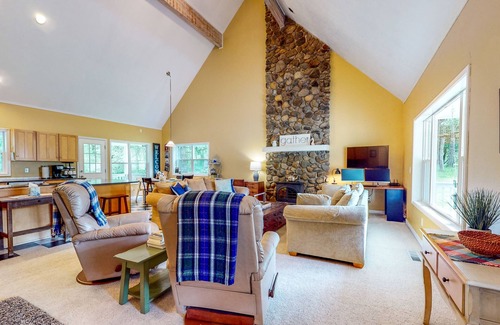 Walking inside, you will instantly take notice of the open-concept layout. The spacious living room is the heart of the home with its river rock fireplace and vaulted ceilings. Kick back and stream your favorite TV shows or movies, or tune into your remote work projects at the designated desk space.