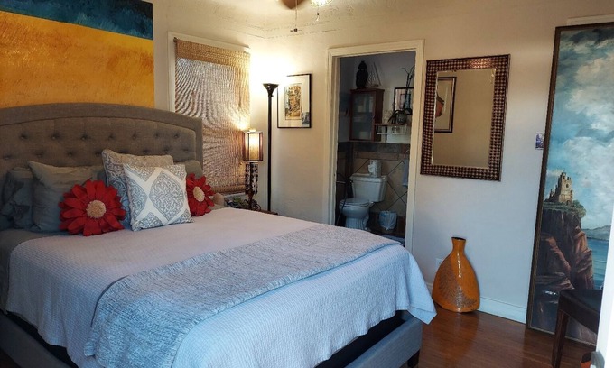 Wonderful Spanish Revival / private bedroom and bathroom with private entrance. Queen size bed, mini fridge, microwave and Keurig coffee machine. There's a great backyard to relax in - feel free to fire up the barbecue! Pour yourself a glass of wine and sink into a good book! Free WI-FI, Smart TV, central air and heat and street parking.