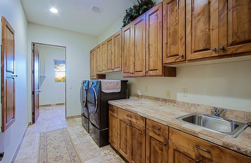 The backyard has everything you will want in Arizona vacation. Large covered patio with luxury patio furniture perfect for relaxation and dining out side, out door heater for chilly winter nights and cooler for hot summer nights, built in BBQ grill with out door mini fridge, putting greens, yard games, ping pong table, darts, and of course large heater pool and spa with water feature.