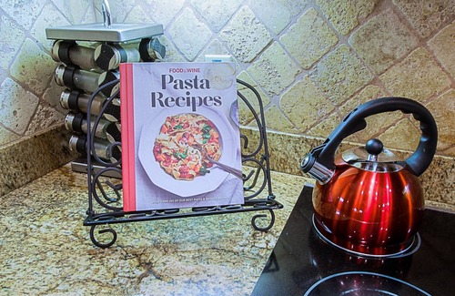 Large gourmet kitchen with kitchen island and breakfast bar, built in 42 inch GE Monogram fridge, cooktop, wall oven, trash compactor, kitchen equipped with everything you need for cooking: condiments, spices, coffee, tea, hot cocoa, bottle of wine included.