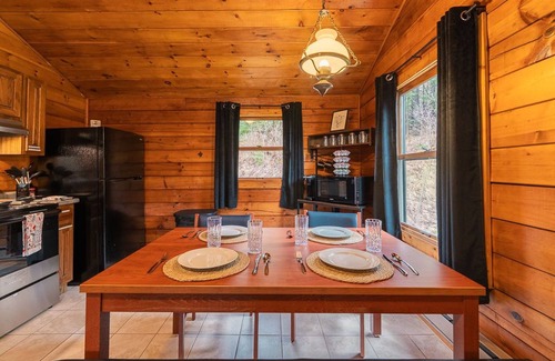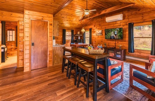 This one-story cabin features two inviting bedrooms, each furnished with comfortable beds, soft linens, and plenty of storage. A full bathroom is conveniently located just down the hall.