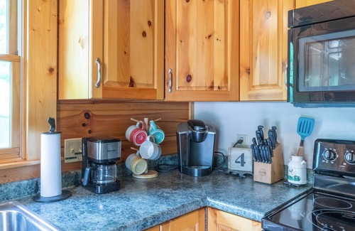 When you’re in the fully-stocked kitchen, gaze through the window over the sink to watch for wildlife that might be strolling past. There is a deck here, too, so grab a cup of coffee and step outside to breathe in the fresh mountain air. What a perfect start to your day! This kitchen has everything you need to make this your home away from home, from utensils to plates, to cookware. All it needs is you!