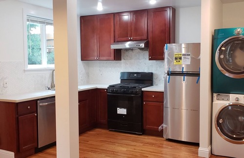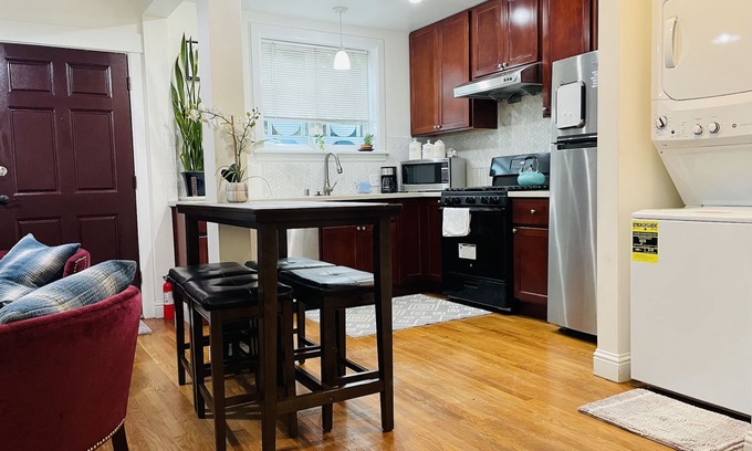 Highlights: This two-bedroom, max 4-person apartment with hardwood floors has a quartz stone countertop, stainless steel appliances, microwave, refrigerator, gas stove, washer and dryer (detergent provided), coffee maker (coffee, tea, extras), and a fully stocked kitchen for all your cooking enjoyment.