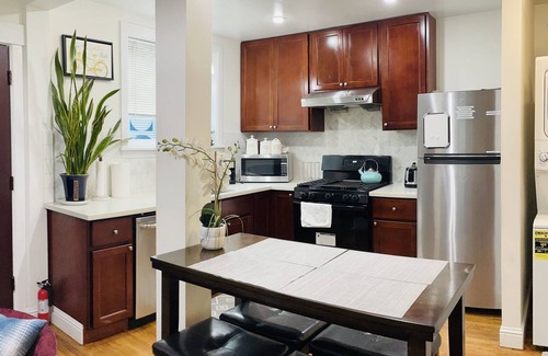 This beautiful and stylish unit is a fully furnished, fully stocked, adorable unit in a mixed-used Victorian triplex with lively flowers year-round, bougainvillea and fragrant jasmine garden, patio, table, chairs, and an outdoor heat lamp is a fantastic jumping-off point for anywhere in Oakland or the Bay Area. This unit has a modern bathroom and kitchen with stainless steel appliances, a quartz stone countertop, a dishwasher, a hardwood floor, a washer, and a dryer inside the unit.