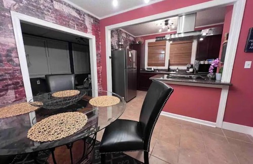 Welcome to your home away from home!! 2 Bedrooms (Split plan) & 2 bathrooms. The first bdrm is serene & located in the front of the home. The second bedroom is located in the rear of the home for total peace & quiet. The family room is huge & features a cocktail corner w/ a disco light. This home has a full kitchen with an espresso machine, toaster, waffle maker. This home also has a full washer/dryer. Theres also a desk and printer for your convenience. The outside is peaceful like being in the country in the middle of the city.