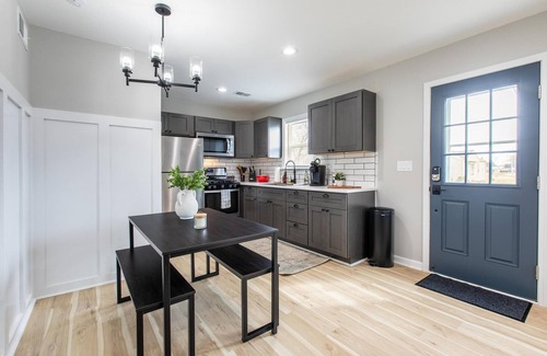 Welcome to our quaint, beautifully-renovated, and well-appointed two-bedroom ranch in Melvindale! Updated with modern fixtures, a new kitchen, central AC and heating, our home provides a fun, safe, and easy place to rest and relax! We are a 15-min drive to downtown Detroit and DTW Airport, 30-min to Royal Oak (and surrounding neighborhoods), and 35-min to Ann Arbor, with easy access via highways and public transpo to all of your other favorite spots in Southeast Michigan. With a cute but spacious, open-floor-plan entertaining living and dining room as well as a garage, secluded back yard, and smart TVs in every room, this is the perfect little home for any gathering or getaway!