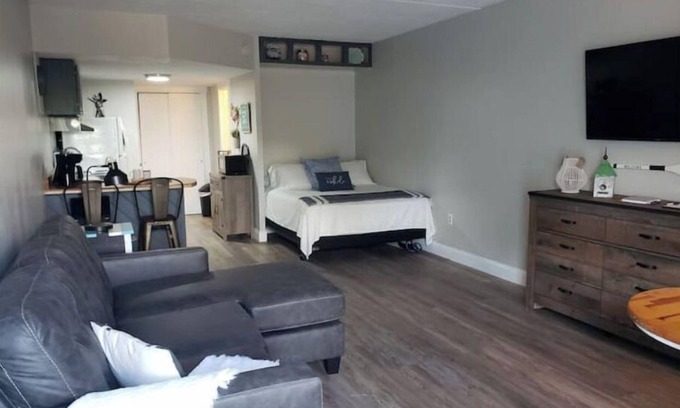 Relax in the efficiency space offering kitchen, queen bed and walk-in shower. The couch pulls out to a queen bed. A few steps from your door is a saltwater pool with views of the lake. Bath/Kitchen towels provided, but NOT SHEETS. Smart TV for streaming and Xfinity high speed internet. NO Boat/Trailer parking at the condo. Parkway Marina charges $10 for the first day and $6 for additional days to put in, take out and park boat/trailer. We are located 2 minutes (.7 miles) from Parkway Marina.