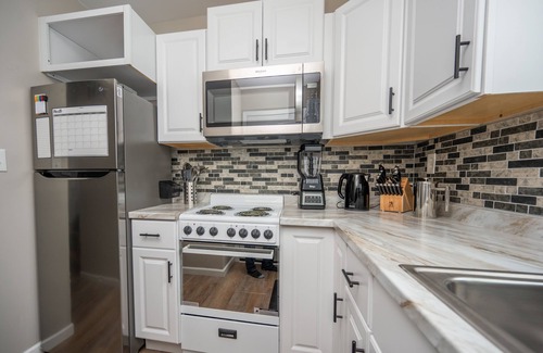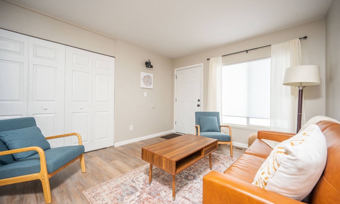 The living room is warm and inviting, with comfortable seating for relaxing after a day of working or exploring. The kitchen is fully equipped for preparing home-cooked meals. Both bedrooms are designed for comfort, with high-quality linens and a modern feel. The bathroom modern, with a shower/tub combo and plush towels. Overall, guests can expect a comfortable and peaceful stay in a convenient location.
