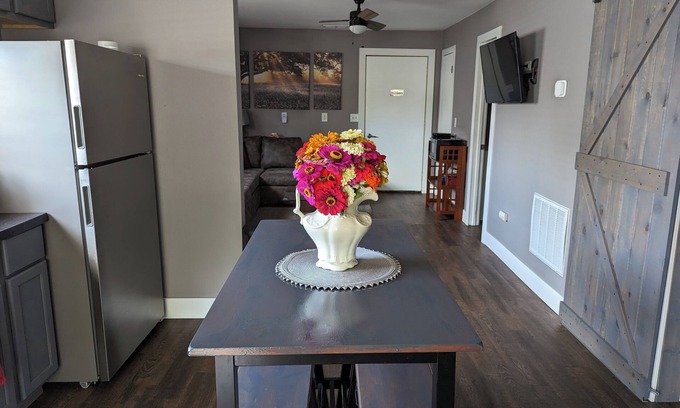 Quaint cottage with two bedrooms, about 800 sq. ft. Main bedroom has a queen bed and a Roku TV (no cable). Small bedroom has two twin beds. Living room has a Roku TV (no cable), as well. The home does not have central air, it has one window AC unit and ceiling fans. A dog is NOT allowed without approval. Smoking is NOT allowed. Only two vehicles are allowed to park in designated spots.
