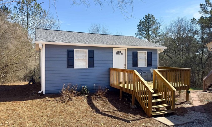 This 650 sq ft guest house was remodeled early in 2022 & is a great place for folks needing a temporary "mid-term" rental. We cater to folks that are in between homes or going through a major remodel and need a quiet comfortable place for 1-3 months. The guest house has high ceilings, a full kitchen, a private bedroom with lg closet and a full bathroom as well as laundry. It is very quiet and deer frequently pass thru the yard but is also close to Downtown Woodstock & Downtown Roswell.