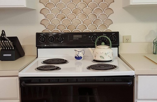 The house has two porches and a deck. From the enclosed porch you can watch the serene views from inside the home. The enclosed porch has its own door for privacy and with the addition of a blow up mattress can easily be converted into a third bedroom. The two bedrooms each contain queen sized beds.The kitchen is fully furnished.