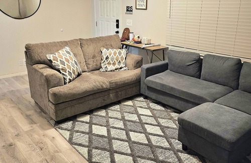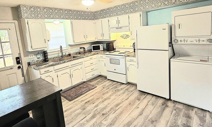 Enjoy a nice quiet evening on the back deck or curl up on the couch and watch Tv. Both bedrooms have a queen sized memory foam bed with a smart tv. The primary bedroom also has a desk for studying if needed. The newly remodeled bathroom has a nice walk in shower. The kitchen has all new appliances that include an electric range, a full sized refrigerator, microwave, air fryer and electric kettle. There is also a washer and dryer in the home. There is a fully fenced back yard with a deck. The front yard has a porch deck as well. There is covered parking for 1 car in the carport and additional parking in the driveway and also street pparking. The house is close to multiple shopping centers including Walmart and Sam's Club. Smoking is allowed outside.