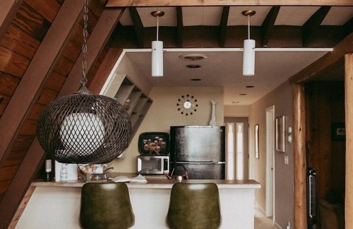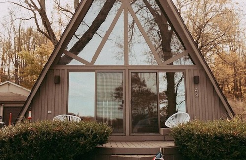 Come on over to the lake and chill out in our retro cottage! Built in 1967 by a family friend, our A-frame cabin features cozy and comfortable living space in a rural setting. A living room, dining room, kitchen, full bath, and bedroom fill out the downstairs, and the upstairs loft features an office area, half bath, and additional bedroom with balcony.