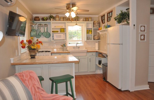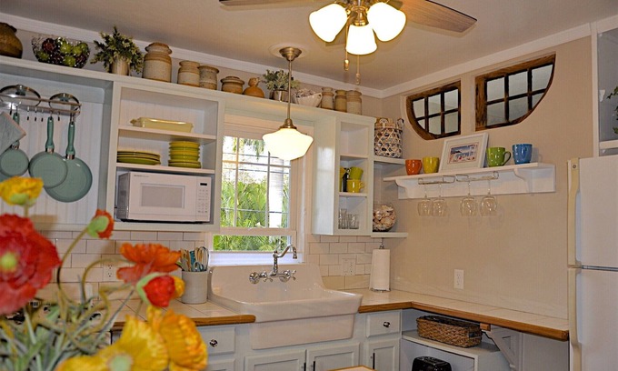 In the living room, the carpenter built a curio cabinet using arched top doors from Europe. Below is a colorful shelf made from old tin ceiling tiles. A cool shell mirror hangs on the wall. Grass rug completes the coastal look of the room. Like all open floor plans, you see right into the kitchen. Small, but completely equipped with a farm style sink and white square tiled counters trimmed in oak. Overhead ceiling fans add to the ambiance. The new washer/dryer is seamlessly tucked under the kitchen peninsula eating counter. Overhead is a new 40” wall mounted smart TV strategically placed. You can watch TV from the bed, the living room and the kitchen.