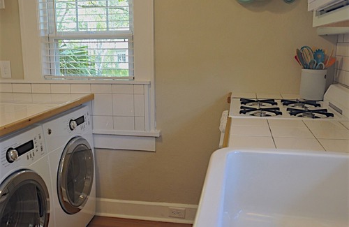 Bright, playful second-floor loft apartment with windows on all sides. Professionally designed to appear larger than its' 360 square feet. Totally furnished with wi-fi, cable TV, linens and kitchen package. Living area, sleeping area with built-ins for shorts and shirts. Lovely kitchen with washer/dryer tucked under counter. Enter through a private courtyard with an abundance of flowers