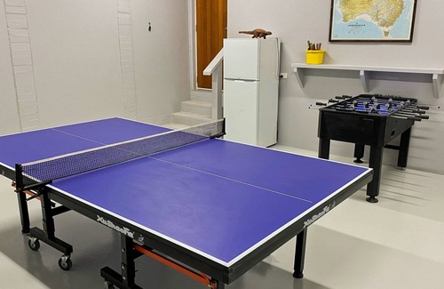 The large garage is fitted with a spare fridge, foosball table and a table tennis table (folding). Realistically only one car will fit with the table folded.