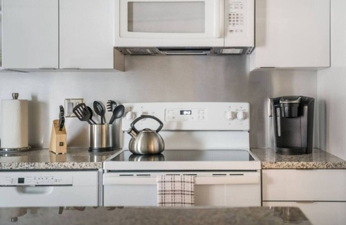Our spacious two-bedroom apartments can accommodate up to six guests with a queen-size bed and a pull-out sofa that sleeps two. You'll also have two modern bathrooms, both of which feature rain shower heads. You’ll adore your breathtaking kitchen that’s decked out with stainless steel appliances, granite countertops, a Keurig machine, and more! After a long day exploring the city, unwind in front of your flatscreen TV with Roku and unlimited wifi. Better yet, take in the sights of downtown on your own private balcony.