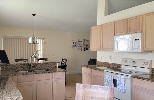 Enjoy your very own full kitchen with all utensils & modern amenities, comfortably seating10 - for those times when you don't feel like eating out. Enjoy your morning coffee at the kitchen table or on the screened in pool deck, enjoy large back yard