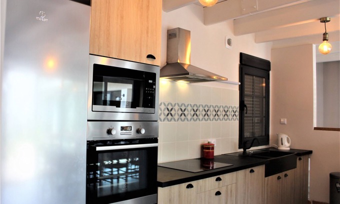 The kitchen is equipped with an oven, a stovetop, and a refrigerator, as well as a coffee maker, an electric kettle, and a microwave. And because there's a washer and dryer, you can go a bit lighter on your packing. Other amenities include a BBQ grill and bed sheets.
