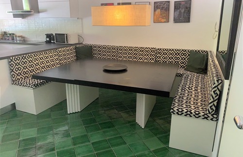 Above the pool, and in front of the living room, there is a patio for relaxing with a large glass table for 14 people and chairs where you can read.
