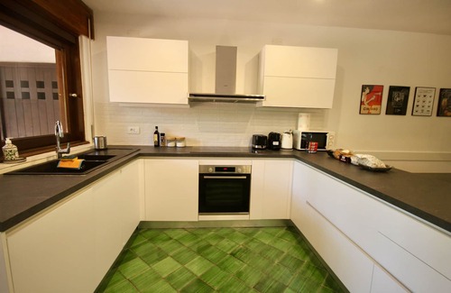 The large fully equipped kitchen with dishes, glasses and pots for 12 people can prepare summer meals for so many people and the adjoining office has a table for 12 people.