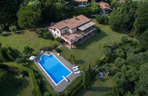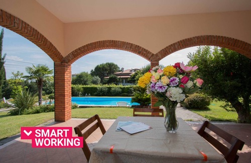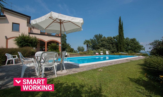 Apartment on the ground floor of a villa with furnished porch to eat in the open-air, garden, shared pool and wonderful view over the lake and the castle, in Soiano del Lago.Located on the ground floor of a villa, the apartment stands out for the large size of the living room, the porch and the bedrooms.The living room has a fireplace, a relaxation area with TV from which German and French channels can also be seen, and a table for 6 people; the living room overlooks the large and bright porch complete with a wooden table, from which you can enjoy a beautiful view of the hills and the lake. The independent and air-conditioned kitchen is equipped with gas stove and all cooking utensils: refrigerator, dishwasher, oven, American coffee machine and toaster. The sleeping area, well separated from the rest of the house, consists of three bedrooms and two bathrooms: 2 double bedrooms complete with large wardrobes, 1 bedroom with single beds and a cot for small children; the first bathroom with shower, toilet and bidet and the second with bathtub, toilet and bidet.On the outside, inside the large green park, there's the large swimming pool from which you can enjoy a splendid view of the lake and the castle.*The apartment is located on the ground floor but a four-step ramp is required to reach it.*Upon arrival or a few days before arrival it may be required to pay a tourist tax, which varies according to local regulations. You will find your reservation details within the Guest Area of Wonderful Italy.We also offer to our guests truly authentic experiences to live like a local. If interested, contact us and we will be more than happy to help you out designing an unforgettable holiday to discover Italian beauties.Soiano del Lago, an enchanting town near Lake Garda on the Brescia side, takes its name from "Solis ianua" (literally “Gateway of the Sun”) which is enough to define the characteristics of this small village in Valtenesi, rich in vineyards and olive trees surrounded the green of the hills. In Soiano del Lago, the Castle dating back to the 10th century is definitely worth a visit, as it is also the site of events during the summer. To visit nearby, there is Moniga del Garda with its splendid beaches and Castle of Padenghe.For guests who prefer a relaxing trip, it is possible to reach Salò and take a boat to visit the lake while sailing.The hinterland of Soiano del Lago offers quiet places surrounded by the typical olive trees of the Valtenesi area, on Lake Garda, where tourists can take part to tastings and stop at local restaurants to taste the typical "spiedo bresciano" (meat and potatoes slowly cooked on a revolving spit).The apartment is located about 40 km from the Verona airport and 10 km from the Desenzano railway station.