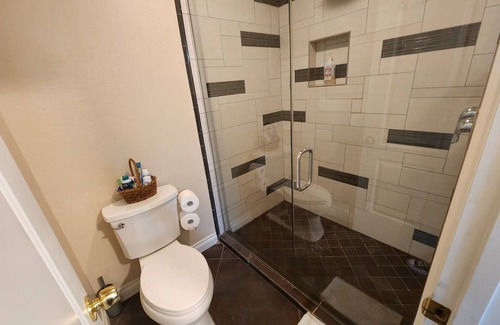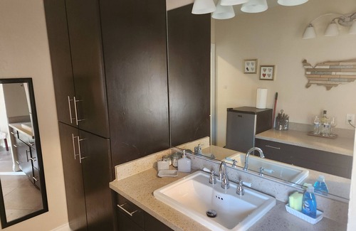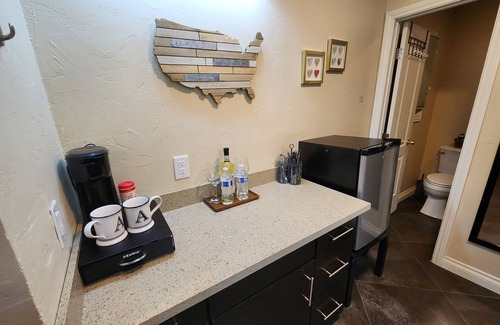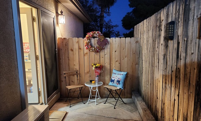 Private patio leading into a private studio fully furnished with a sitting area, queen bed, breakfast bar and more. Walk to your favorite bar, car show or local Boulder City event. Enjoy coffee in the morning or a cocktail in the evening on your patio or sitting area. One designated parking spot conveniently close to the suite. Additional near by street parking.