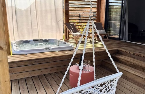 Accommodation: Our 2 bedroom lodge and Spa will be the ideal accommodation for your family stay, with a surface of 31 m2, it has a central room opening onto the terrace, a fitted and equipped kitchen (nespresso coffee maker, toaster, kettle, microwave grill, ceramic hobs, dishwasher, electric hood and refrigerator), a dining table and its chairs, sofa and coffee table. A bedroom with 160 bed and a wardrobe and a second bedroom with 80 cm cabin bed and 2 80 cm pullaway beds (can be assembled to make 1 160 bed), a bathroom with shower and sink and a separate toilet. A covered terrace with Chilean women, sitting area with its suspended armchair and heated SPA in any season at 36°C for relaxing moments. The lodge benefits from summer air conditioning and winter heating. Flat screen TV and free wifi. Animals are not allowed. Parking at the entrance. Sheets and towels included. End-of-stay household not included, in addition to the price of 80 euros. IMPORTANT: rallies of more than 5 people in one lodge are not allowed, it is also forbidden to move furniture or dishes from one lodge to another.