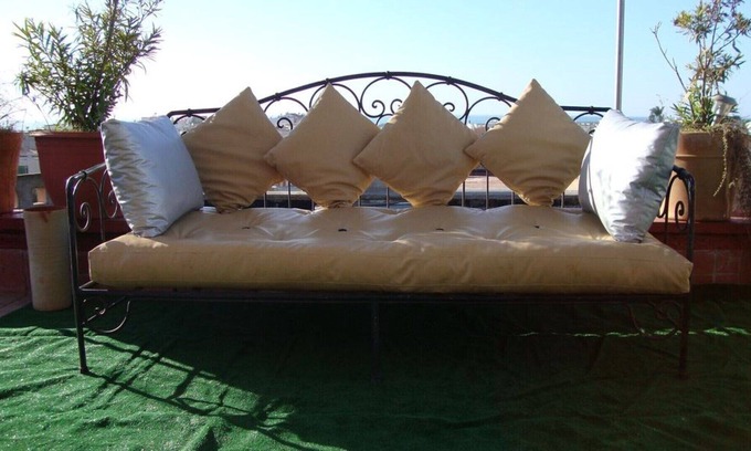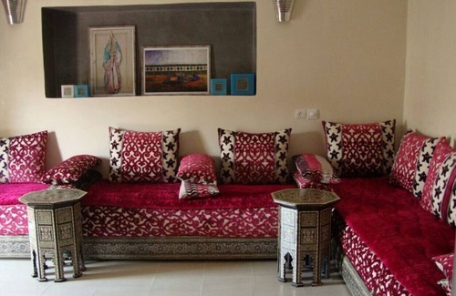 A large living room with three Moroccan sofa beds with flat screen satellite balcony + DVD.