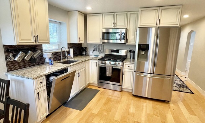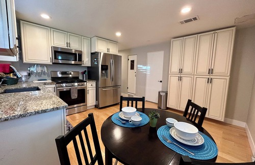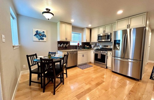 Welcome to your home away from home! Charming & stylish brick 2 bed 1 bath duplex on a peaceful, tree-lined street, one of the best blocks in West Highlands. Our rental offers the perfect mix of urban convenience and residential tranquility. Laminate hardwood floors are perfectly coupled with fresh furnishings and an updated fully-equipped eat-in kitchen. In this well kept clean modern house you will find a remodeled full bathroom with fresh white linens, FAST Free Wi-fi and workspace with desk, Central A/C and Heat with on demand hot water. Rent price is the only cost to our guests all utilities and services to keep house running and in order are paid by owner. The primary bedroom has plush king mattress with fresh crisp cotton white linens and a walk in closet, you can unwind with a smart tv in room. The secondary bedroom has a hybrid plush queen sized bed with crisp white linens, walk in closet space and view of the yard. The fully fenced shared yard features a covered patio with plenty of seating and table, flower garden, raspberry lined fence and you'll love to grill in the back patio and enjoy the Colorado Skies. Take advantage of the shared detached 2-car garage for parking and/or storing all of your adventure gear. Just moments from Tennyson Street, Sloans Lake, Highlands, Downton Denver. Walking distance from over 15 of some of the cities best restaurants/cafes, farmers market May through October, parks, neighborhood rec-center, cute local shops and night life. Easy access to major highways, I-70 will take you to Colorado Mountains for skiing. Enjoy the Bike paths near by. This place is really in the heart of it all! The perfect home base to explore Denver and for travelers who want to experience the city like a local.