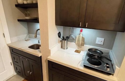 This suite boasts a spacious bedroom and bath which include a step-in shower. The kitchenette is compact and has everything you may need.