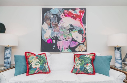 The living room and dining room (with a table for eight) look out to the fabulous porch and are decorated in bright happy colors. 48' flat screen TV is High Definition . They offer a cool retreat on summer days or a cozy place to curl up with a good book.