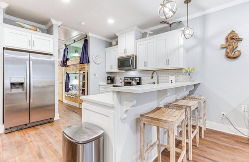 KITCHEN: Stove/oven, microwave, dishwasher, refrigerator w/ ice maker, dishware/flatware, Keurig single-serve/drip coffee maker, 3-person breakfast bar