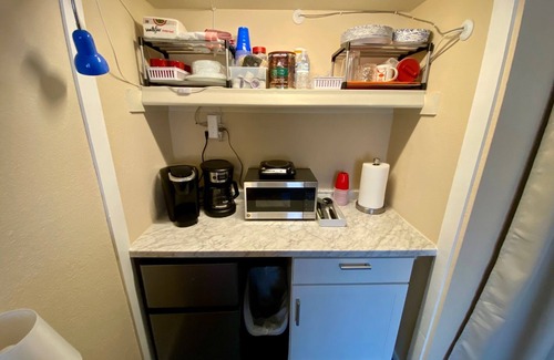 Luxury efficiency (450 sq ft) unit for 2 or 3; newly remodeled. Private entrance, parking, private bath, king-size bed, air mattress for 1, exclusive access to free heated pool (heat pump set to 82 but may be less on cold winter nights), kitchenette (air fryer with oven/toaster/broiler; microwave, hot plate, frig, Keurig, reg pot), 2 TVs. 20 min from airport/downtown/Mariners ballpark/Glendale; 30 from Scottsdale/Sun City/Cave Creek. Safe neighborhood. Free WiFi, Netflix, Amazon. Wash/dryer