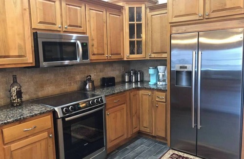 Catch those mountain sunsets! 2nd floor Condo w/ elevator. Walking distance to Ridges Marina, restaurants and the Sand Bar who host live music events The bar also has a volleyball court and fire pit with outdoor seating. The development has a community pool just next door. Spacious Living/Dining area. Upscale fully equipped Kitchen. Gas Fireplace. Roku TV & Board Games. Door leading onto Balcony w/ seating for 4.