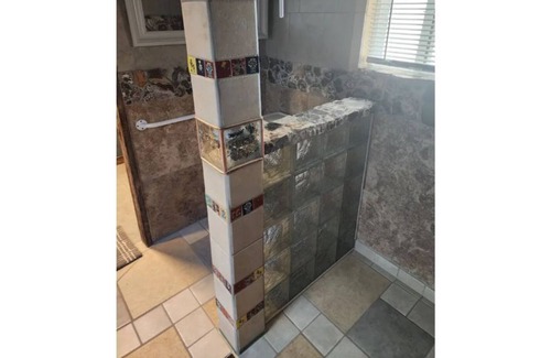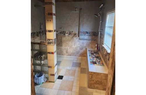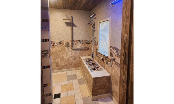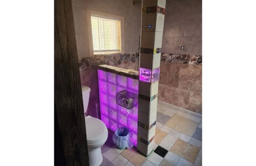 Take it easy at this unique and tranquil getaway. Relax and unwind or visit our local historical sites or spend time with our amazing critters. This cabin is a stunning Dios de la Muertos themed cabin with an amazing spa shower. The custom shower features 5 separate shower heads to choose from. It is adorned with Dios de la Muertos tile and the most gorgeous rocks that were found in the area (rockhounding tours avail) and cut and used as a border in the wall tile. There's a bidet toilet feature.