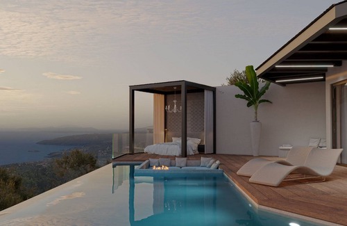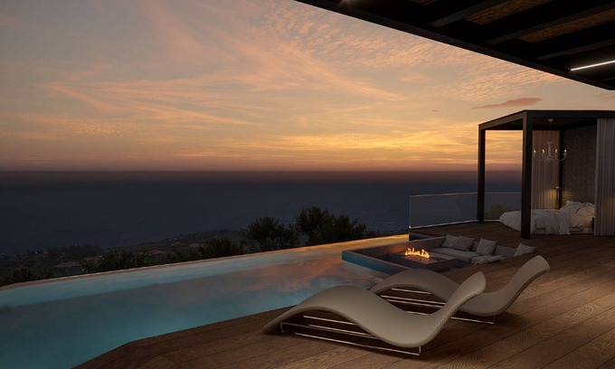 Experience the epitome of luxury at Villa Scabior, an exquisite retreat designed for honeymooners seeking an idyllic escape. Perched atop a hill, this deluxe suite offers a breathtaking panorama of the Ionian Sea, allowing you to feel truly majestic as you take in the stunning vistas that stretch beyond the horizon. The villa's open-plan design creates a spacious and light-filled living area, seamlessly blending contemporary comfort with a minimalist yet luxurious charm. The suite's master bedroom, elegantly appointed with a king-size bed, provides a serene sanctuary, complemented by a bathroom featuring modern, understated decor.