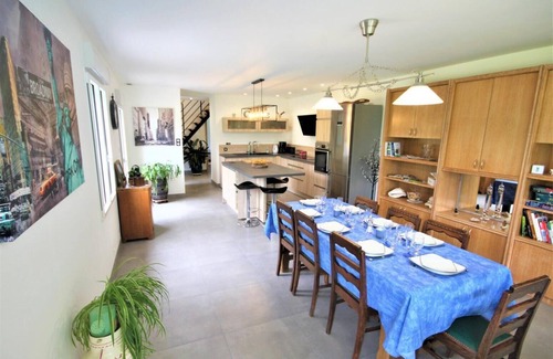 - Large bright living room with fully equipped open kitchen (built-in oven, dishwasher, induction hob, coffee maker, griddle, toaster...), - Large dining table and scullery with washing machine, - Comfortable living room with sofas, flat screen TV and pellet stove (provided), - Double bedroom with 160x200cm bed and its private bathroom with Italian shower (hairdryer), - Separate toilets, First floor : - Double bedroom with 140x190cm bed and office space (Ethernet sockets), - Bathroom with corner bath, cabin shower and WC, - Bedroom for 2 people with 2 beds 90x200cm (twinable) and cot, - Double bedroom with 160x200cm bed. Terrace with garden furniture, barbecue and deckchairs. Ping-pong table and porch with swing. Outdoor power outlet. Animals on site: sheep in an enclosed orchard opposite the house and a donkey and goats in a pasture behind the house. Hiking trails from the cottage. The owners have renovated this former relay with taste and modernity to guarantee you a successful stay. The large bright living room, with its pellet stove, offers a beautiful open view of the gite's vegetable garden and the green garden and its orchard. You can enjoy the terrace with barbecue on site, as well as the deckchairs and the ping-pong table. You will be able to have the pleasure of crossing the animals nearby which will please the whole family. You will have access to all shops in Yvetot 5 km from the cottage and can easily access nearby tourist attractions (loops of the Seine, coastal beaches, Rouen...). Depending on the season, fruits and vegetables from the vegetable garden can be offered to you. For your comfort, beds are made and linen provided. Possibility to store bicycles and motorcycles in the garage building at the entrance of the gîte.