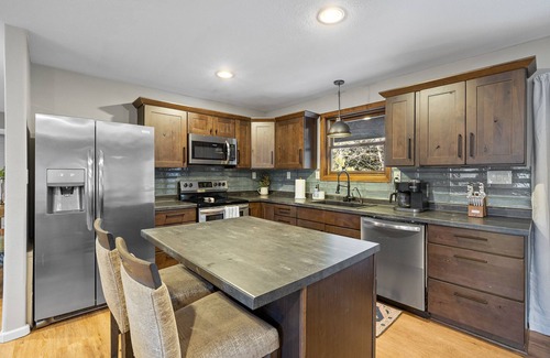 Deadwood Pines Hideaway boasts four spacious bedrooms and three bathrooms, elegantly accommodating large wedding parties or family gatherings. Modern comforts meet rustic charm throughout the home, featuring inviting living spaces adorned with picture windows that frame stunning forest views. Prepare delicious meals in the fully equipped kitchen, gather around the cozy fireplace for evening celebrations, or unwind on the expansive deck while soaking in the mesmerizing surroundings. With paved roads for easy access and a garage at your disposal, convenience is always at your fingertips.