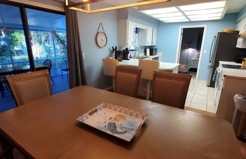 Great restaurants, unique shops, plenty of special events, friendly people.13 miles of pristine white sandy beaches. New Smyrna Beach is enclosed by 2 national parks and has the ocean and the river on both sides of the island. Great for water sports fishing, surfing, paddleboarding, kayaking. Scuba diving. Jet skiing and shell combing. The area has lots of land conservation making it a heaven for Manatees and their calves, and dolphins.Lots of cranes and other tropical birds as well as the white bald eagle. The house has a nice kitchen with a large kitchen table. The living room has a large Flatscreen TV, fireplace, and plenty of seating. Nice screened-in porch area to get out of the sun and enjoy outside.The Master bedroom has a King bed and a bathroom within the room. The 2nd and 3rd bedrooms have 2 twin beds per room.